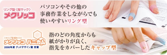 オフィスの定番紙めくり「メクリッコ」 形状はパソコン作業中にも便利なリング型や、指先でもめくり易いキャップ型等がございます。 メクリッコ誕生20周年を記念して、リング型にはラメ入りタイプが仲間入りしました。