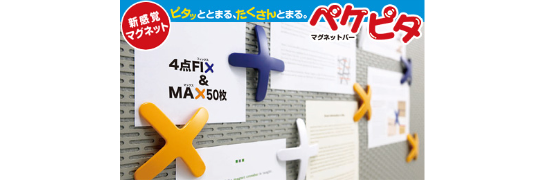 マグネットと樹脂の弾性を利用した、ユニークな形状のマグネットバー「ペケピタ」 マグネット部だけでなく、樹脂の弾性を利用して先端部でも用紙を押さえて留める構造です。